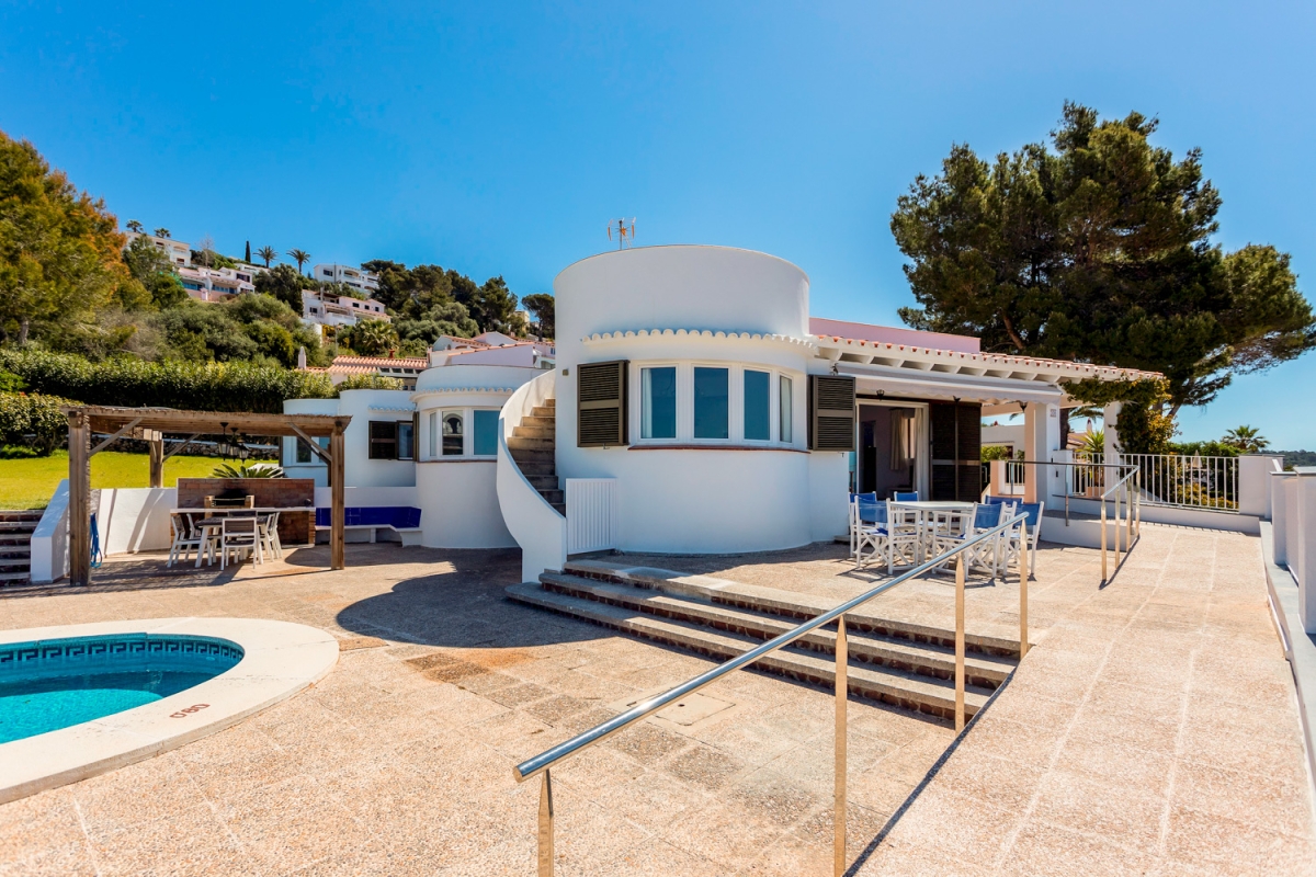 Una elegante villa de un dormitorio en Son Bou que ofrece vistas panorámicas al mar, piscina privada...